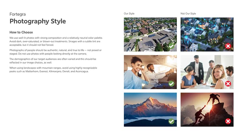 The photography guidance is worth noting specifically. We defined a distinct visual style emphasizing authentic, well-lit, natural images with a neutral palette, and even specified which mountain peaks to avoid in stock photography to prevent the brand from feeling generic. That level of specificity is what makes guidelines actually useful.