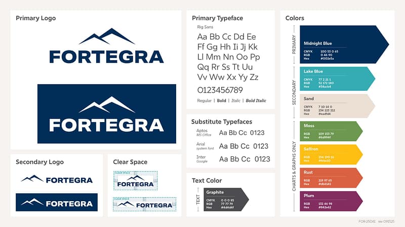 Every element of the refresh was codified into a “quick reference” brand guidelines document: logo usage rules, clear space, primary and substitute typefaces (Rig Sans for Adobe, Aptos for Office, Arial for system, Inter for Google), color values for print and screen, photography direction, and a clear framework for what is and isn’t on-brand.